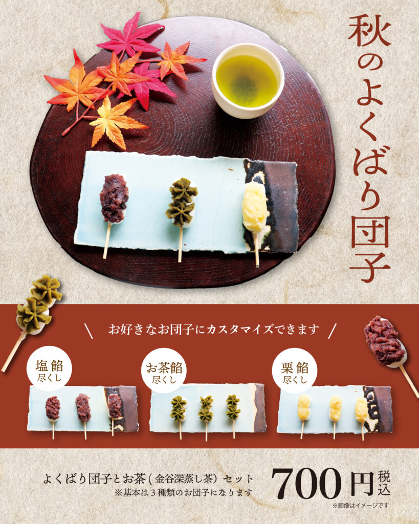また、秋限定の「秋のよくばり団子」も販売中です。塩餡・お茶餡・栗餡の3種からお選びいただけます。気分に合わせて“わたしだけの一皿”をお楽しみください。
