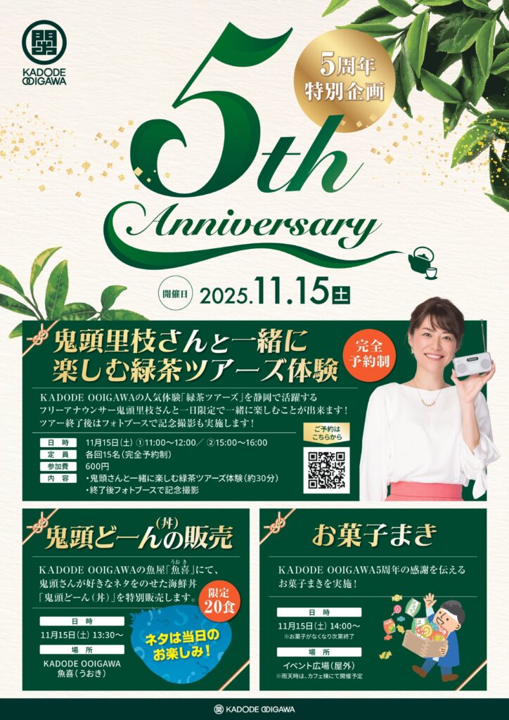 KADODE OOIGAWAの5周年を記念して、フリーアナウンサー鬼頭里枝さんをお迎えし、1日限定の特別イベントを開催します。緑茶体験や限定グルメ、お菓子まきなど、盛りだくさんの内容でお届けします。