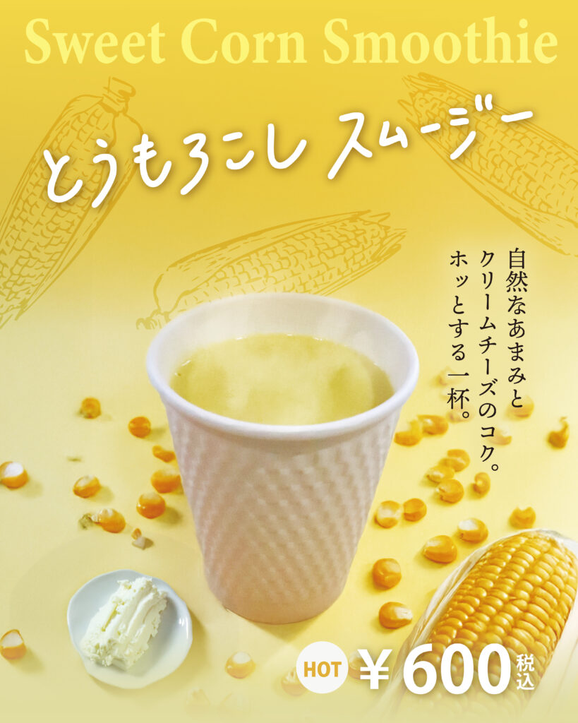 2025年11月1日(土)よりスムージースタンドにてHOTドリンク「とうもろこしスムージー」の販売がスタートいたします。地元で採れた甘みたっぷりのとうもろこしを使用し、 クリームチーズのコクを加えた、やさしい味わいの一杯です。寒い日にほっと温まる、やさしい甘さのスムージーです。 ぜひこの機会に、『とうもろこしスムージー』をお楽しみください!