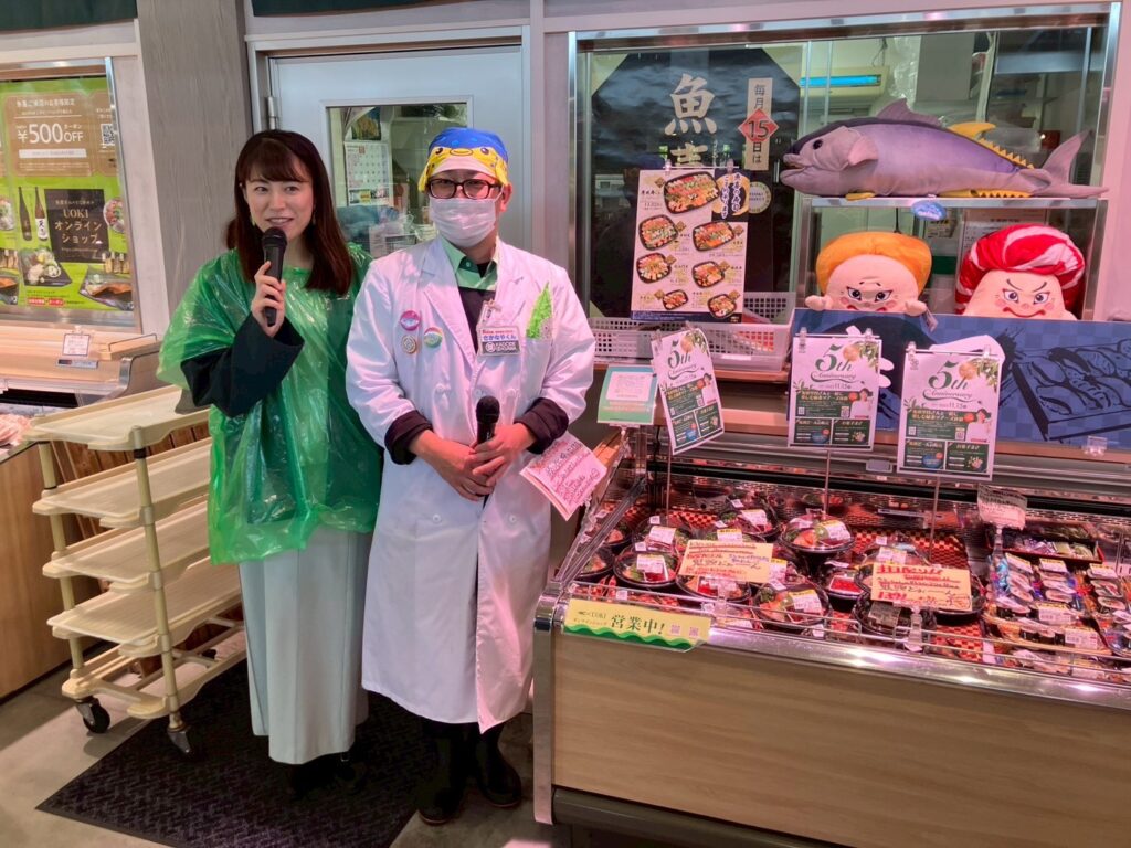 魚屋「魚喜(うおき)」では、鬼頭さんが好きな寿司ネタを盛り込んだ特製海鮮丼「鬼頭どーん(丼)」を数量限定で販売。鬼頭さんとさかなやくんによる掛け合いで、555円で販売することが決定!たくさんのお客様にお集まりいただき、急遽じゃんけん大会で購入権利争奪戦が繰り広げられることに!!大盛り上がりでした。
