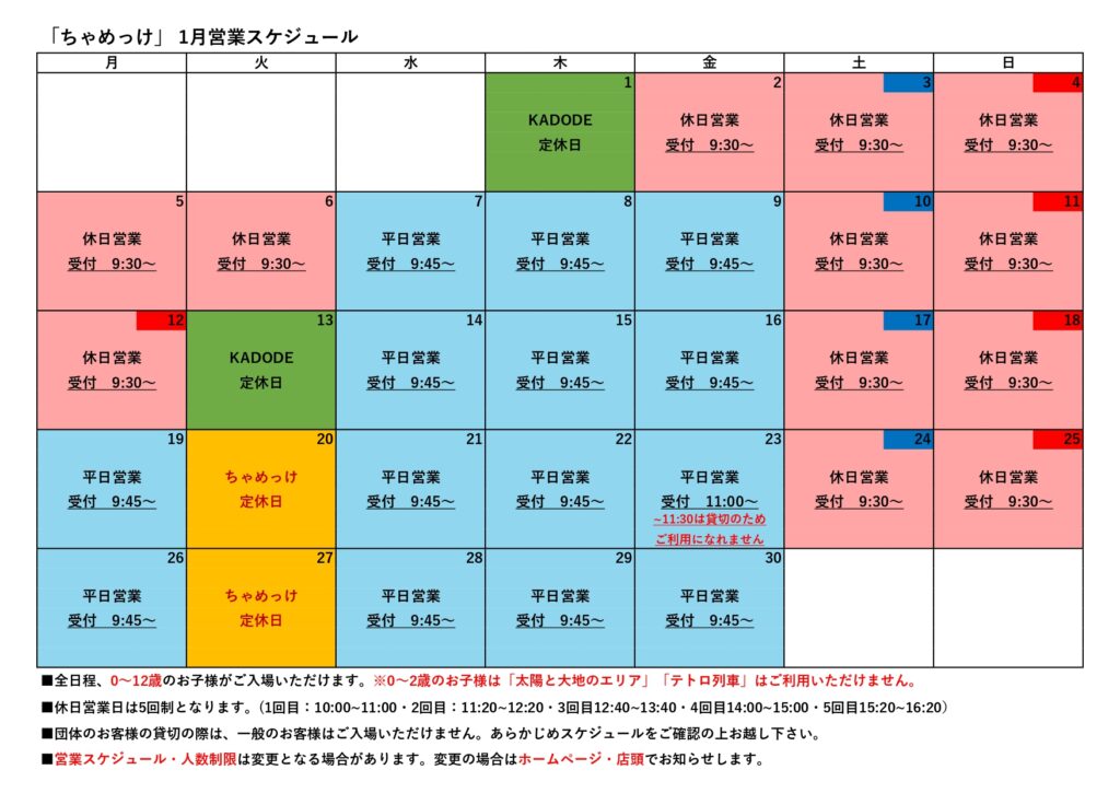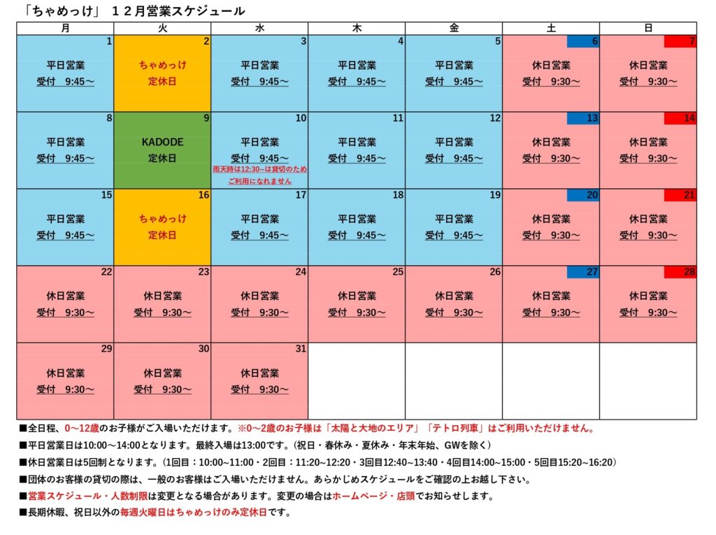 キッズパークちゃめっけより12月、1月の営業スケジュールをお知らせいたします。