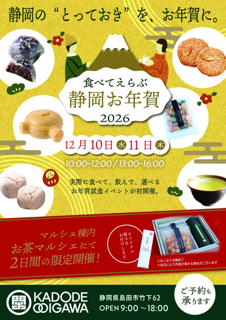 今回、KADODE OOIGAWAでは、『食べてえらぶ静岡お年賀2026』 を初開催いたします。コンセプトは 「静岡のとっておきを御年賀に」。静岡ならではの魅力あふれる商品を、試食・試飲しながらお選びいただけます。