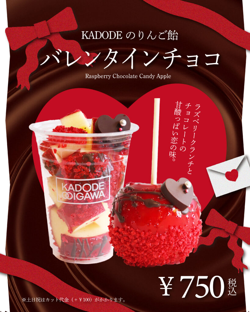 チョコレートでコーティングしたりんご飴に、甘酸っぱいラズベリークランチとハートのチョコをトッピング。バレンタインシーズン限定の特別なフレーバーです。