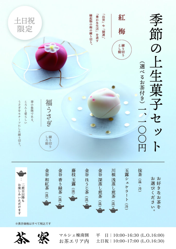 KADODE OOIGAWA茶寮では、土日祝限定で「季節の上生菓子セット」のご提供スタートいたします。