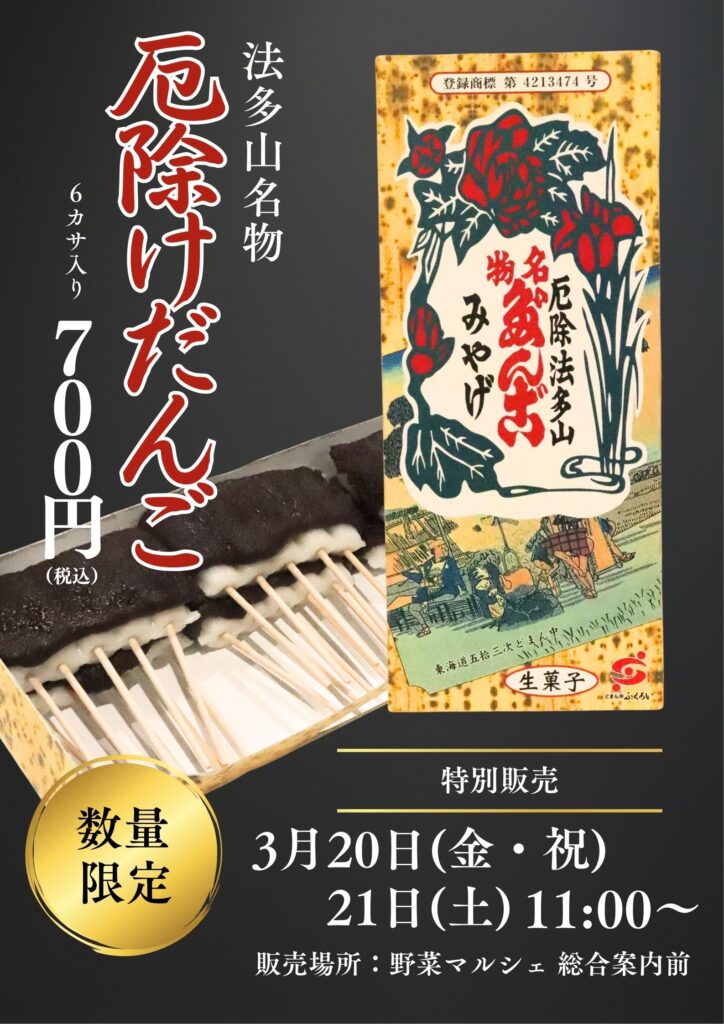 いつもKADODE OOIGAWAをご愛顧賜り、誠にありがとうございます。御利益があるとして知られる袋井市の名産「法多山厄除だんご」を特別販売いたします。「法多山厄除けだんご」は食べることで厄を落とし贈られた人も厄落としができると、参拝土産にご近所や家族へ配る文化があります。ぜひ静岡県土産として、またご自宅用にお買い求めください。【日時】2026年3月20日(金・祝)、21日(土)11:00~【販売数】両日300個限定【場所】マルシェ棟総合案内前
