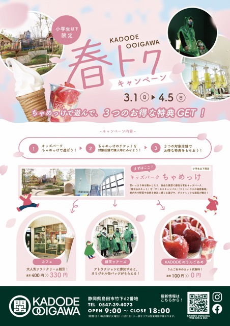 3月1日(日)~4月5日(日)の期間、「キッズパークちゃめっけ」をご利用いただいたお客様を対象に、館内連携企画「春トクキャンペーン」を実施いたします。